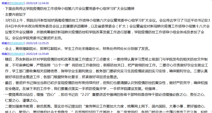 首先召開馬院黨支部黨員學習會。通過前期自學和這次集中學習,黨員們一共學習了《習近平:在統(tǒng)籌推進新冠肺炎疫情防控和經(jīng)濟社會發(fā)展工作部署會議上的講話》《習近平主持的這次重要會議,強調了兩件大事》《習近平:全面提高依法防控依法治理能力健全國家公共衛(wèi)生應急管理體系》《中共教育部黨組關于統(tǒng)籌做好教育系統(tǒng)新冠肺炎疫情防控和教育改革發(fā)展工作的通知》《大專院校開學24條》《省委常委會會議精神》等文件。