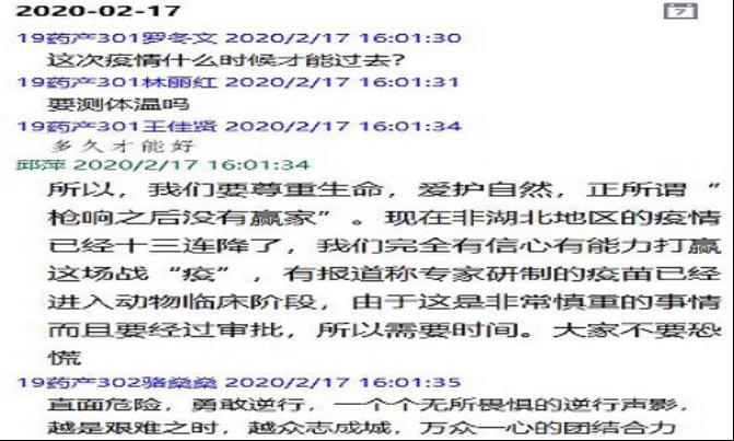 特殊時期的思政課堂上,馬院教師們通過語音溝通、線上答疑、轉(zhuǎn)發(fā)防控知識等方式,積極向?qū)W生科普預(yù)防新型冠狀病毒的相關(guān)知識,以馬克思主義哲學(xué)思維,引導(dǎo)學(xué)生樹立科學(xué)觀念,不聽謠、不信謠、不傳謠,并通過解讀習(xí)近平總書記關(guān)于新型黃莊肺炎疫情防控的重要講話精神以及政府出臺的各項(xiàng)措施,引導(dǎo)學(xué)生認(rèn)識社會主義制度的優(yōu)越性,營造良好充滿正能量的輿論氛圍,從而堅(jiān)定打贏疫情防控阻擊戰(zhàn)的信心。