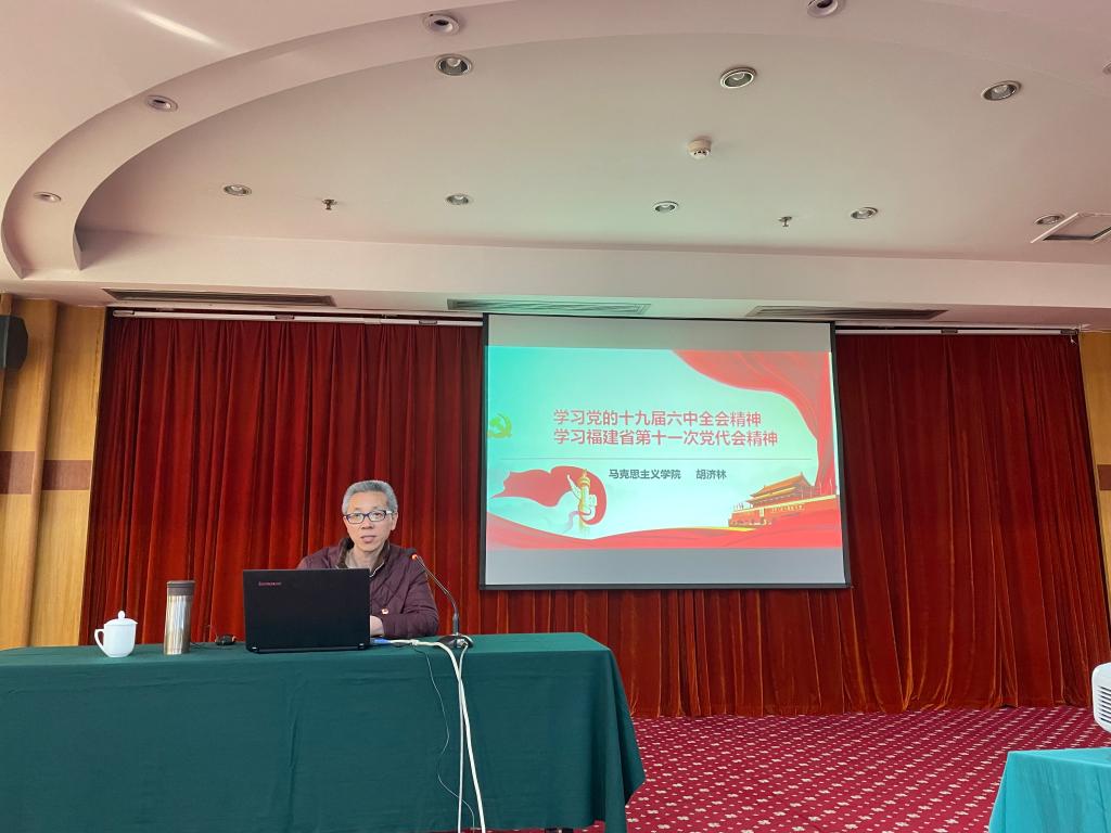 為了更深入地學(xué)習(xí)黨的十九屆六中全會(huì)精神,2021年12月7日上午,馬克思主義學(xué)院教師胡濟(jì)林副教授在閩江飯店十五層西湖廳為離退休黨總支上學(xué)習(xí)黨的十九屆六中全會(huì)精神專題黨課。