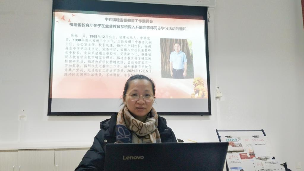 隨后,黨支部開展了交流研討活動。由丁愛芝老師分享題為“以史為鑒、開創(chuàng)未來——學習《習近平:不斷鞏固拓展黨史學習教育成果團結(jié)帶領(lǐng)全國各族人民滿懷信心奮進新征程建功新時代》”的學習心得。她談到,我們要總結(jié)好、鞏固好、拓展好黨史學習教育成果,用黨的奮斗歷程和偉大成就鼓舞斗志、明確方向,用黨的光榮傳統(tǒng)和優(yōu)良作風堅定信念、凝聚力量,用黨的實踐創(chuàng)造和歷史經(jīng)驗啟迪智慧、砥礪品格,在新征程上更加堅定、更加自覺地牢記初心使命、開創(chuàng)美好未來,贏得更加偉大的勝利和榮光。接著,陳洪月老師分享題為“盡職盡責 甘于奉獻——開展向陳煒同志先進事跡專題學習會”的心得體會。她談到,我們要向陳煒同志學習,學習他對黨忠誠、信念堅定的政治品質(zhì);還要學習他甘當蠟炬、甘為人梯的高尚情操,堅持“功成不必在我、功成必定有我”的宏闊胸懷,腳踏實地,做實事、做好事、解難事;學習他淡泊名利、克己奉公的優(yōu)良作風。