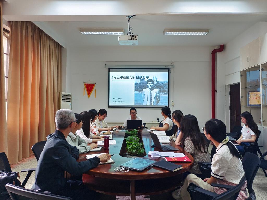 隨后,張?zhí)煳耐窘Y合教學科研和自身工作實際,精讀了《習近平在廈門》一書并進行研學分享。該書通過13篇采訪實錄,真實還原和再現(xiàn)習近平在廈門的從政軌跡和領導風范。從習近平同志當年這些施政作為中,可以深切領悟到:立志是一切工作的前提,并且要立志做大事。即便我們暫時處于平凡崗位,或許還不曾遇到急難險重,但仍然要始終懷著一份“士不可不弘毅”的擔當精神,立足本職,埋頭苦干,胸懷長遠抱負,從點滴做起,把小事當大事干,把小事干成大事,用一流業(yè)績成就精彩人生。