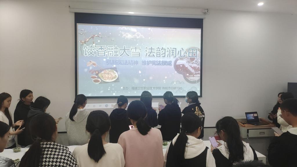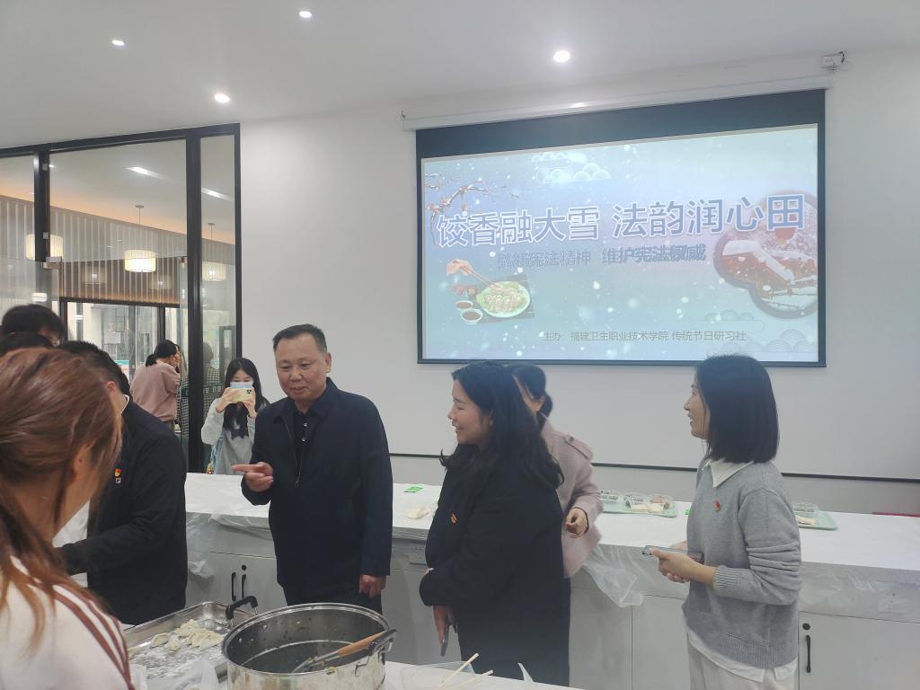 2024年12月5日,為推動中華優(yōu)秀傳統(tǒng)文化與法治理念的深度融合,馬克思主義學(xué)院第一黨支部全體黨員教師在“憲法宣傳周”來臨之際,于“一站式”學(xué)生社區(qū)指導(dǎo)學(xué)生社團(tuán)開展以“餃香融大雪,法韻潤心田”為主題的特色活動。