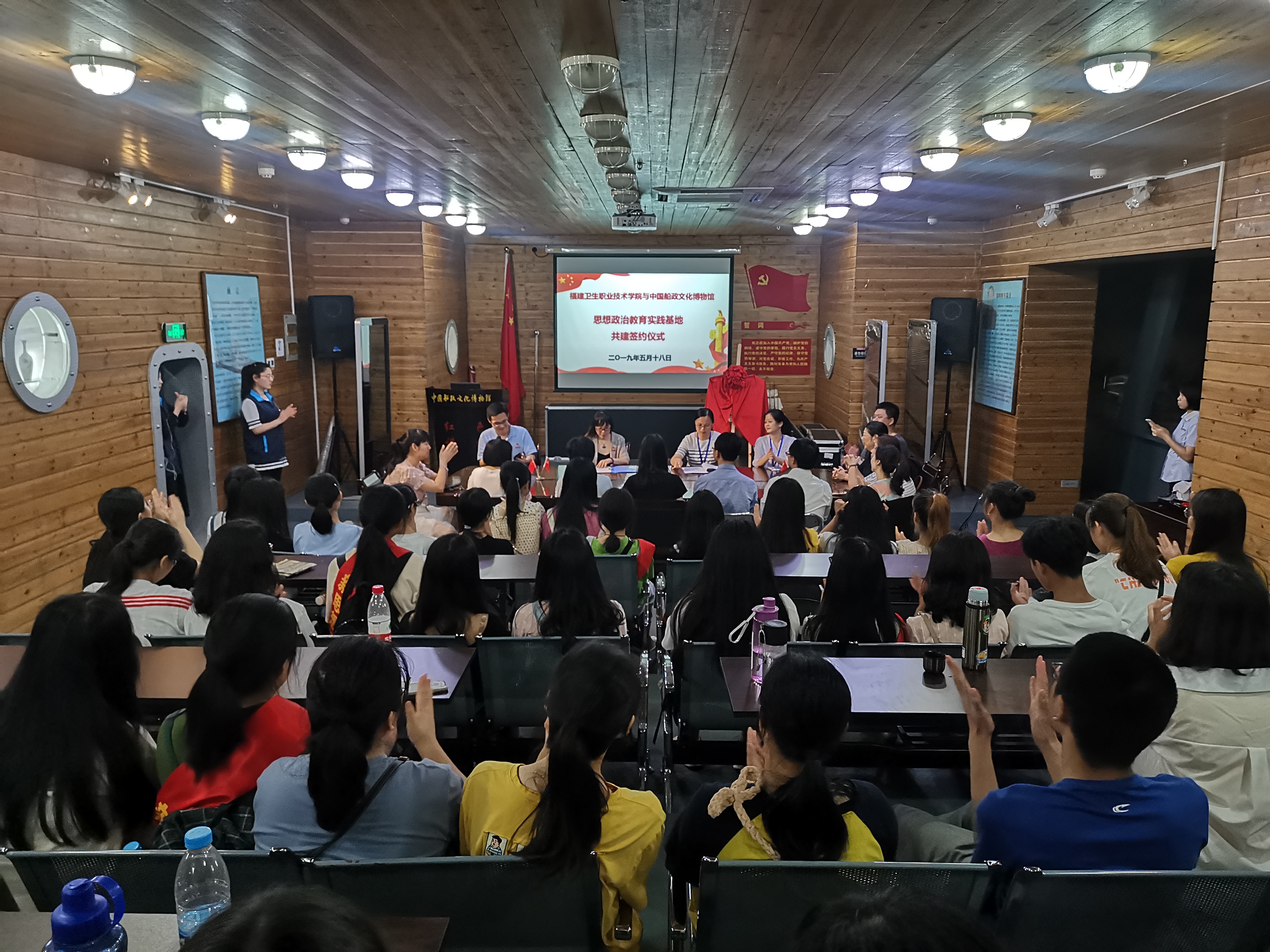 為紀(jì)念五四運(yùn)動100周年和新中國成立70周年,福建衛(wèi)生職業(yè)技術(shù)學(xué)院習(xí)近平新時代中國特色社會主義思想讀書社(簡稱讀書社),于2019年5月18日在中國船政文化博物館參加福建衛(wèi)生職業(yè)技術(shù)學(xué)院與中國船政文化博物館共建思想政治教育實(shí)踐基地簽約儀式。出席本次簽約儀式的有福建衛(wèi)生職業(yè)技術(shù)學(xué)院馬克思主義學(xué)院名譽(yù)院長魏立娜、馬克思主義學(xué)院院長熊美蘭、馬克思主義學(xué)院副院長黃曦以及馬院全體教師,中國船政文化博物館副館長王芳以及習(xí)近平新時代中國特色社會主義思想讀書社全體成員。