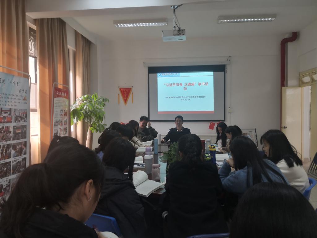 為深入學(xué)習(xí)宣傳貫徹習(xí)近平新時(shí)代中國特色社會(huì)主義思想,2019年12月24日下午,習(xí)近平新時(shí)代中國特色社會(huì)主義思想讀書社致遠(yuǎn)隊(duì)在行政樓107學(xué)習(xí)交流《習(xí)近平用典》立德篇?;顒?dòng)由指導(dǎo)老師江洪老師主持,致遠(yuǎn)隊(duì)全體成員參加了活動(dòng)。