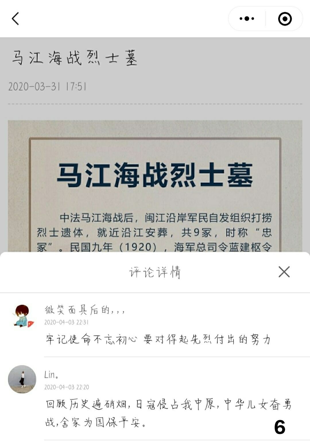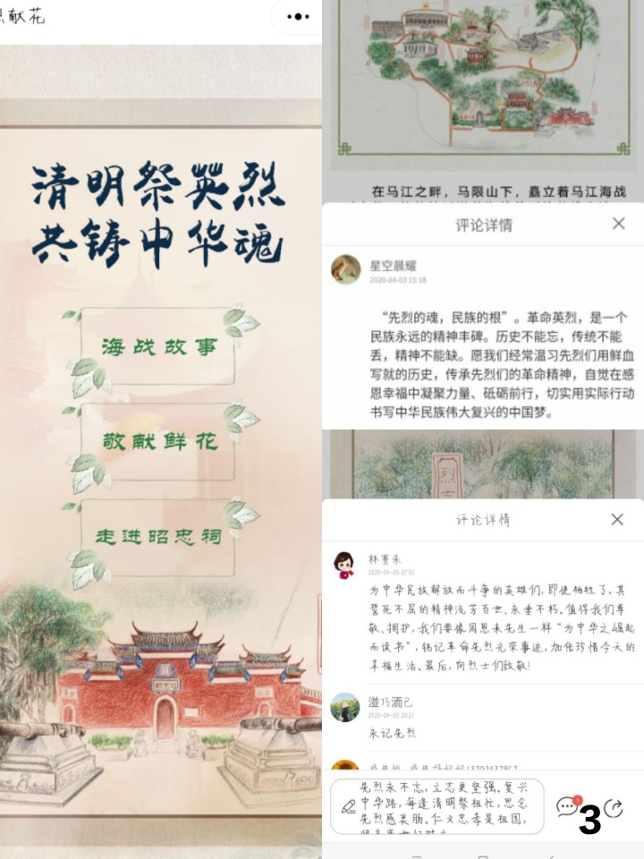 隨著線上導(dǎo)航走進(jìn)昭忠祠,我們看到昭忠祠介紹、烈士陵園和定位導(dǎo)航。為了紀(jì)念中法馬江海戰(zhàn)犧牲的英烈,昭忠祠始建于清朝光緒十一年,內(nèi)祀700多名烈士神位,從宏觀和微觀的角度紀(jì)念馬江海戰(zhàn)及對(duì)中國(guó)近代海軍發(fā)展的影響。在烈士陵園的評(píng)論區(qū),我們可以看到許多同學(xué)對(duì)于烈士表達(dá)的哀思,對(duì)烈士表達(dá)敬重之意。