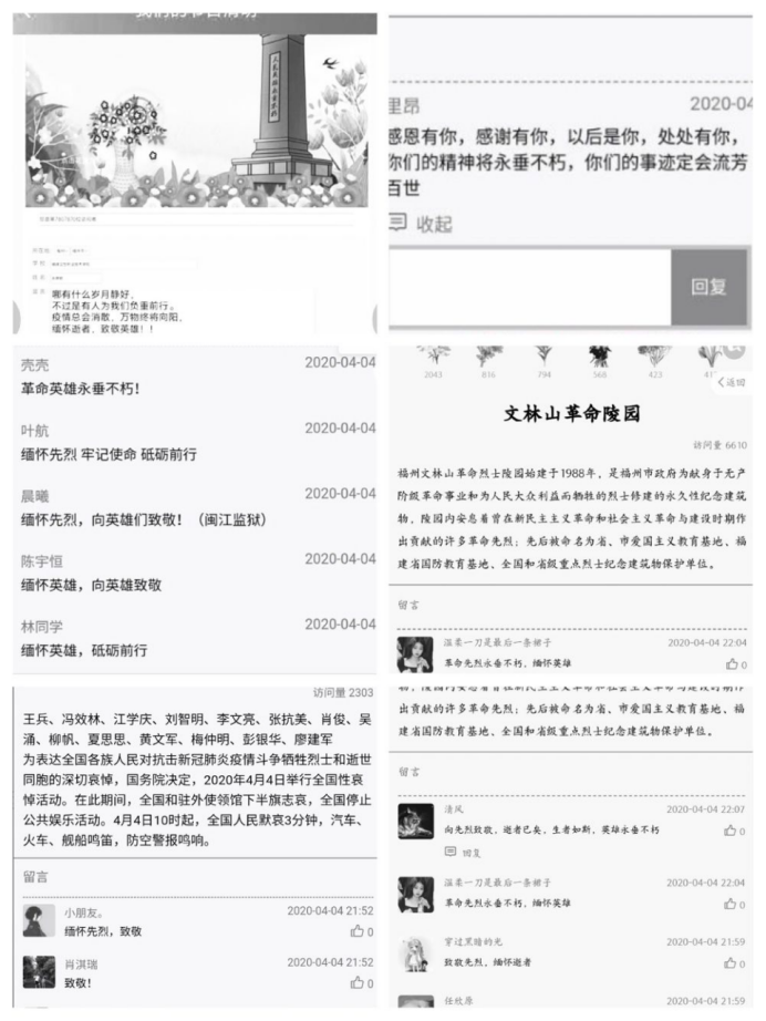 本次活動(dòng)主要包括兩個(gè)部分:討論追憶先烈、進(jìn)行網(wǎng)上祭奠英烈留言?;顒?dòng)開展過程由負(fù)責(zé)人組織本社團(tuán)成員們討論追憶先烈的過程中去感受中英雄事跡,微信公眾號(hào)搜索清明紀(jì)念或中國英烈網(wǎng)祭奠平臺(tái)發(fā)表祭奠感言,表達(dá)對(duì)英烈的感恩和敬仰。此次活動(dòng)的舉辦引得學(xué)生熱烈反響,有助于同學(xué)們學(xué)習(xí)和弘揚(yáng)中華民族傳統(tǒng),讓同學(xué)們了解清明節(jié)的歷史由來和傳統(tǒng)習(xí)俗。