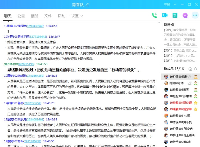 同學們在QQ進行簽到后,首先楊軍、魯麗、張凌晴3位同學分別向同學們進行了《為了人民謀發(fā)展的人大代表——季炳云》、《革命戰(zhàn)爭年代以及社會主義建設時期的人民觀》以及《抗擊疫情的普通人》的分享和交流,她們的分享讓我們明白了人民群眾是維護社會穩(wěn)定的主體力量,也是社會大局持續(xù)穩(wěn)定的源頭活水。