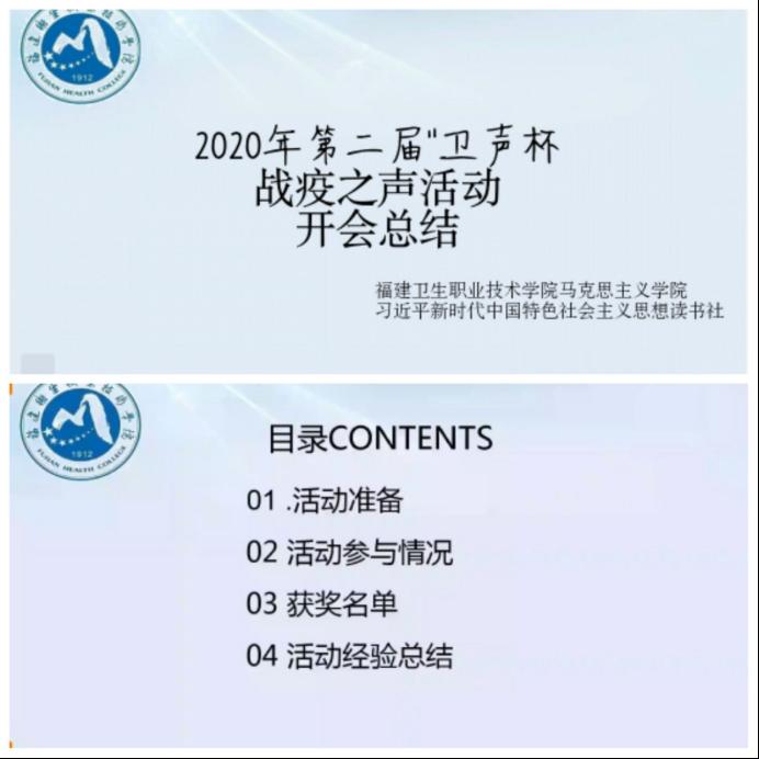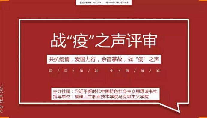 我校習(xí)近平新時(shí)代中國(guó)特色社會(huì)主義思想讀書(shū)社開(kāi)展的第二屆"衛(wèi)聲杯"戰(zhàn)"疫"之聲活動(dòng)進(jìn)入尾聲,收到52件作品申報(bào)參評(píng),入圍作品15件于福建衛(wèi)院天使吾修公眾號(hào)線上進(jìn)行的公眾投票已截止。在進(jìn)行了統(tǒng)計(jì)票數(shù)和作品整理后,于2020年5月6日晚7點(diǎn),在QQ群平臺(tái)召開(kāi)作品評(píng)審視頻會(huì)議。評(píng)審團(tuán)由4位馬克思主義學(xué)院指導(dǎo)老師及8名讀書(shū)社干事組成,秉著公平公正與認(rèn)真負(fù)責(zé)的態(tài)度做好作品評(píng)審工作。