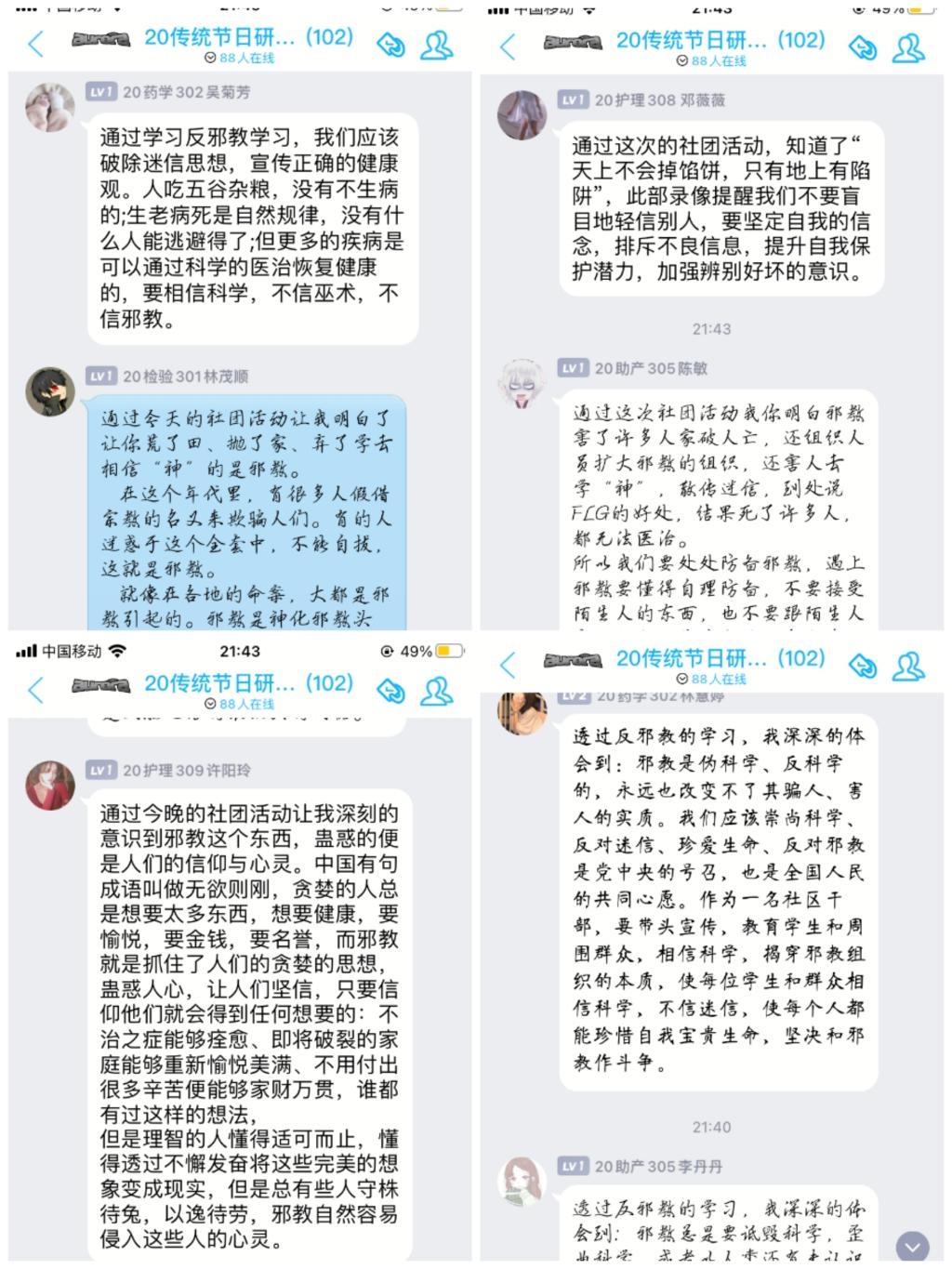 大會結(jié)束后,傳統(tǒng)節(jié)日研習(xí)社成員在線上展開了熱烈討論,積極踴躍地發(fā)表了警示教育短片觀后感,他們表示邪教是偽科學(xué)、反科學(xué)的,應(yīng)該崇尚科學(xué)、反對迷信、反對邪教、珍愛生命,要堅定科學(xué)信念,努力學(xué)習(xí)科學(xué)知識,從科學(xué)的精神和態(tài)度把握生活,不斷提高自身識別和防范邪教的能力。
