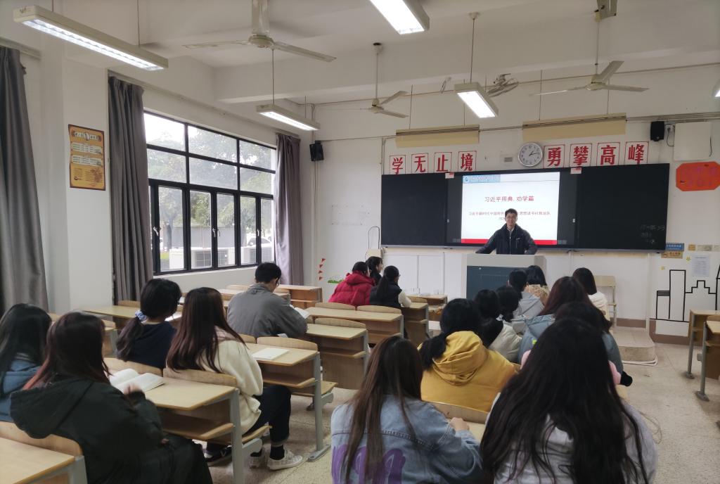 本次活動(dòng)學(xué)習(xí)的主題是《習(xí)近平用典》之“勸學(xué)篇”。江洪老師指出,學(xué)習(xí)是中國(guó)共產(chǎn)黨的優(yōu)良傳統(tǒng)和政治優(yōu)勢(shì),是中國(guó)共產(chǎn)黨人戰(zhàn)勝艱難的法寶,習(xí)近平總書(shū)記十分重視并善于學(xué)習(xí)。隨后,江老師和同學(xué)們講解了“吾生也有涯,而知也無(wú)涯”、“腹有詩(shī)書(shū)氣自華”、“學(xué)而不思則罔,思而不學(xué)則殆”等習(xí)近平總書(shū)記在不同場(chǎng)合講話(huà)中使用過(guò)的典故,教導(dǎo)同學(xué)們要樹(shù)立積極進(jìn)取的人生觀,努力學(xué)習(xí),善學(xué)、樂(lè)學(xué),在學(xué)習(xí)中不斷提高自己。