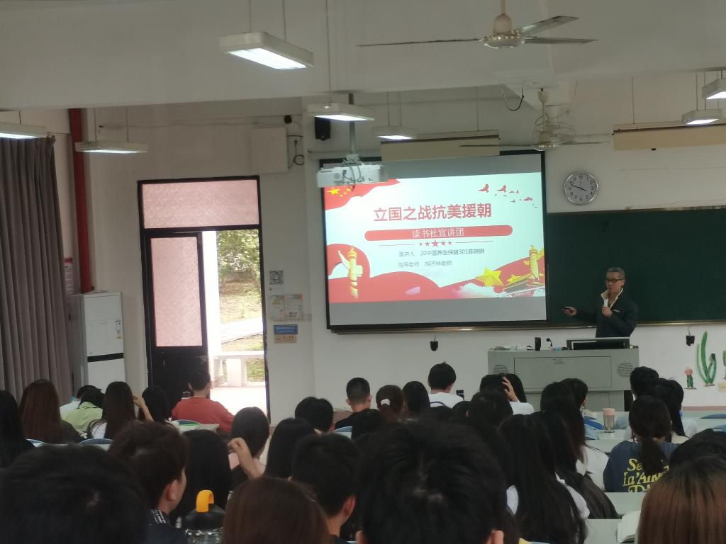 有一種“精神”讓人永遠(yuǎn)銘記,那就是忠誠、勇敢、無私、無畏的愛國主義精神。在胡濟(jì)林為同學(xué)們簡單介紹宣講目的后,讀書社宣講團(tuán)陳琳琳同學(xué)開始作《立國之戰(zhàn)抗美援朝》的專題宣講。陳琳琳生動地講述了抗美援朝的歷史背景和歷史功績,分享了云山戰(zhàn)役、上甘嶺戰(zhàn)役等幾場令人印象深刻的戰(zhàn)役,講述了冰雕連、楊根思等英雄事跡。陳琳琳號召同學(xué)紀(jì)念戰(zhàn)爭,珍愛和平,不忘初心、牢記使命,砥礪前行。