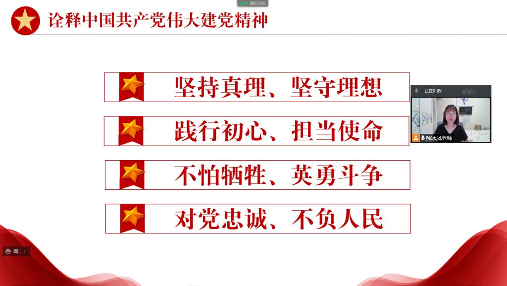 會議開始,顏冰鳳圍繞“回顧中國共產(chǎn)黨百年光輝歷程”,依此向同學(xué)們講述了“詮釋中國共產(chǎn)黨偉大建黨精神”“展望中國共產(chǎn)黨偉大復(fù)興九個必須”“貫徹‘一國兩制’”“寄語廣大青年”“號召全體中國共產(chǎn)黨黨員”等六個部分的內(nèi)容,使同學(xué)們更加深入了解中國共產(chǎn)黨的百年風(fēng)雨光輝路程,引導(dǎo)同學(xué)們深入學(xué)習(xí)領(lǐng)會黨團(tuán)結(jié)帶領(lǐng)人民不懈奮斗取得的偉大成就,不斷汲取前行的力量,為實現(xiàn)第二個百年奮斗目標(biāo)匯聚青春力量。
