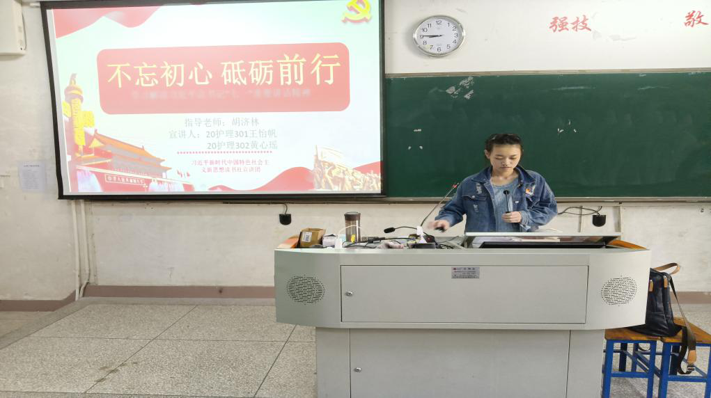 2021年11月5日下午,習(xí)近平新時(shí)代中國(guó)特色社會(huì)主義思想讀書社宣講團(tuán)在胡濟(jì)林老師的組織下,到醫(yī)學(xué)技術(shù)系111教室為21檢驗(yàn)501班、21影像501班開展“不忘初心、砥礪前行”專題宣講。