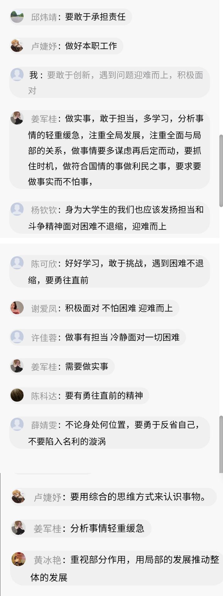 通過此次課程的學(xué)習(xí),同學(xué)們深受啟發(fā),表示要將習(xí)近平總書記的為政精神運用到學(xué)習(xí)和工作中,堅定理想信念、不怕困難、腳踏實地、努力突破自我,為國家的發(fā)展奉獻(xiàn)自己的力量。