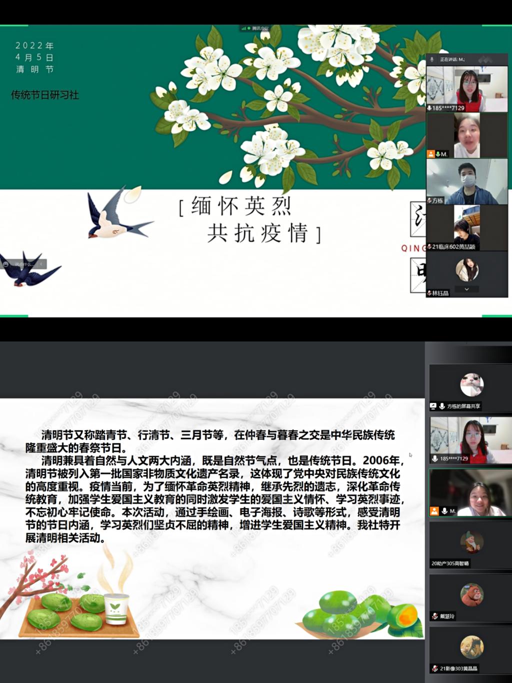 清明節(jié)又稱踏青節(jié)、行清節(jié)、三月節(jié)等,在仲春與暮春之交,是中華民族傳統(tǒng)隆重盛大的春祭節(jié)日。疫情當(dāng)前,為了緬懷革命英烈精神,繼承先烈的遺志,感受清明節(jié)的節(jié)日內(nèi)涵,緬懷抗擊疫情一線犧牲的醫(yī)護(hù)人員和工作人員,致敬疫情阻擊戰(zhàn)中的“逆行英雄”。我校傳統(tǒng)節(jié)日研習(xí)社于2022年4月7日組織同學(xué)們開展了以“緬懷先烈,共抗疫情”為主題的線上清明紀(jì)念活動(dòng)。
