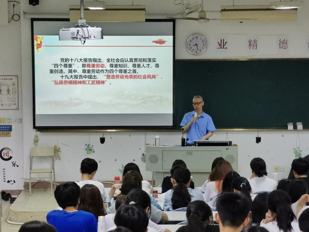 宣講伊始,胡濟林帶領(lǐng)同學(xué)們從“勞動創(chuàng)造世界”“勞動創(chuàng)造歷史”“勞動創(chuàng)造人本身”等方面解讀馬克思主義勞動教育觀。接著介紹中國共產(chǎn)黨繼承和發(fā)展了馬克思主義勞動價值觀、勞動教育觀。黨的十八大報告指出,全社會應(yīng)認真貫徹和落實“四個尊重”,即尊重勞動、尊重知識、尊重人才、尊重創(chuàng)造。其中,尊重勞動作為四個尊重之首。十九大報告中提出,“營造勞動光榮的社會風(fēng)尚”,“弘揚勞模精神和工匠精神”。教育部《大中小學(xué)勞動教育指導(dǎo)綱要(試行)》指出,要使學(xué)生“樹立正確的勞動觀念”“具有必備的勞動能力”“培育積極的勞動精神”“養(yǎng)成良好的勞動習(xí)慣和品質(zhì)”。這些重要論斷進一步豐富和發(fā)展了馬克思主義的勞動價值觀、勞動教育觀。最后,胡濟林結(jié)合大學(xué)生實際情況,希望同學(xué)們注意培養(yǎng)勞動觀念,珍惜他人的勞動成果,提高勞動技能。