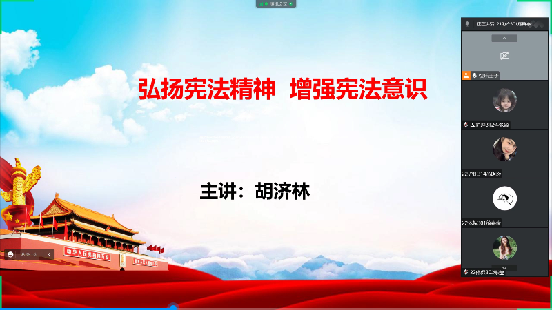 同學(xué)們進入騰訊會議后,由胡濟林進行“弘揚憲法精神增強憲法意識”專題報告,胡濟林系統(tǒng)介紹了“國家憲法日的由來”“國家憲法日設(shè)立的意義”“我國憲法的歷史”“憲法的地位和作用”“如何維護憲法權(quán)威”等方面的內(nèi)容。他號召大家學(xué)習(xí)憲法的內(nèi)容和精神,切實學(xué)懂學(xué)會憲法知識,自覺維護憲法權(quán)威,積極同違反憲法行為作斗爭。