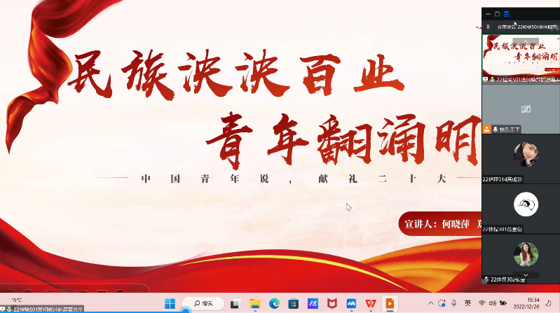 在胡濟林報告結(jié)束后,由何曉萍同學(xué)匯報《民族泱泱百業(yè)青年翻涌明朝》,洪雨辰同學(xué)匯報《我以我手執(zhí)新筆我以我心繪前程》,兩位同學(xué)講述內(nèi)容豐富,語言連貫,都圍繞學(xué)習(xí)貫徹黨的二十大精神來展開,但側(cè)重點略有不同。匯報結(jié)束后,同學(xué)們進行了本次學(xué)習(xí)的交流分享。