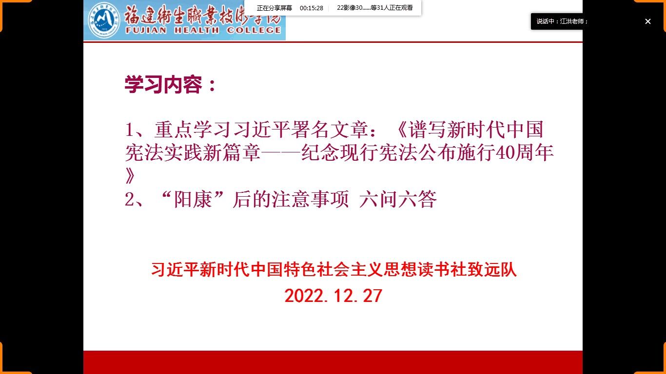 為加強(qiáng)學(xué)生憲法意識(shí)、弘揚(yáng)憲法精神、提升學(xué)生法治素養(yǎng),2022年12月27日,習(xí)近平新時(shí)代中國(guó)特色社會(huì)主義思想讀書(shū)社致遠(yuǎn)隊(duì)在江洪老師的組織下,線上開(kāi)展學(xué)習(xí)習(xí)近平總書(shū)記于2022年12月19日發(fā)表的重要文章《譜寫(xiě)新時(shí)代中國(guó)憲法實(shí)踐新篇章——紀(jì)念現(xiàn)行憲法公布施行40周年》。讀書(shū)社致遠(yuǎn)隊(duì)新老成員30多人按時(shí)參加了活動(dòng)。
