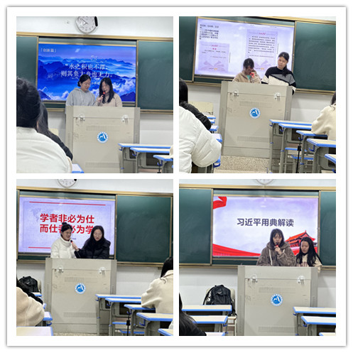 課前,學生按照要求,作了認真的準備。課堂上,學生按照分組順序,逐組上臺交流匯報。各組依次交流了“富貴不能淫,貧賤不能移,威武不能屈”“水之積也不厚,則其負大舟也無力”“茍日新,日日新,又日新”“己所不欲 勿施于人”“物有甘苦,嘗之者識;道有夷險,履之者知”“大鵬一日同風起,扶搖直上九萬里”等習近平總書記曾引用過的經(jīng)典,對典故進行深入的解讀、闡述。每組交流結束后,江洪都會對同學們的交流進行總結與點評,讓同學們有更深的感悟和理解。