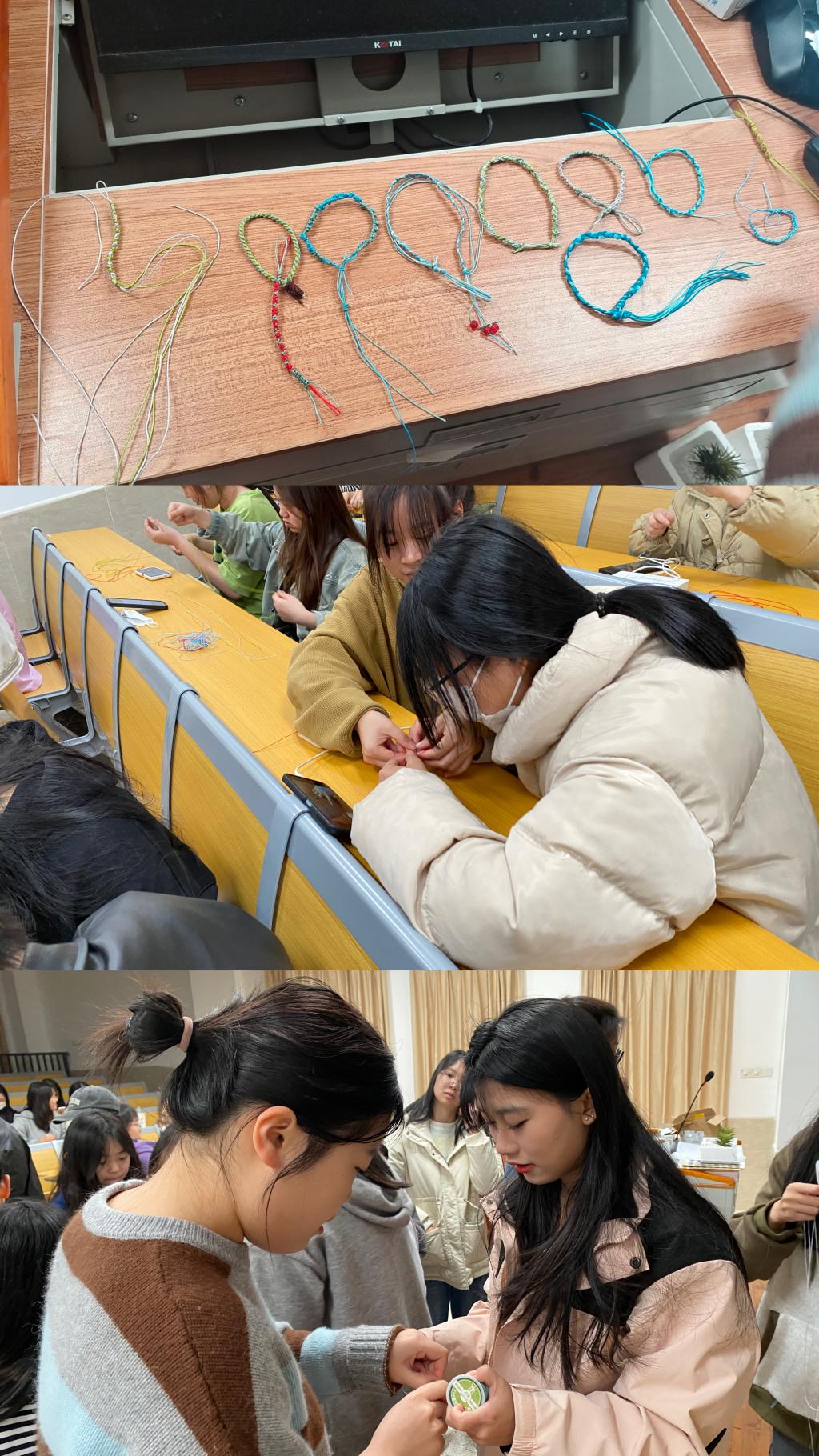 日月陽陰兩均天,玄鳥不辭桃花寒。本次活動以“春”為主題,五人一組編織手繩,領取手繩材料后,在規(guī)定時間內自由發(fā)揮編織完成作品。