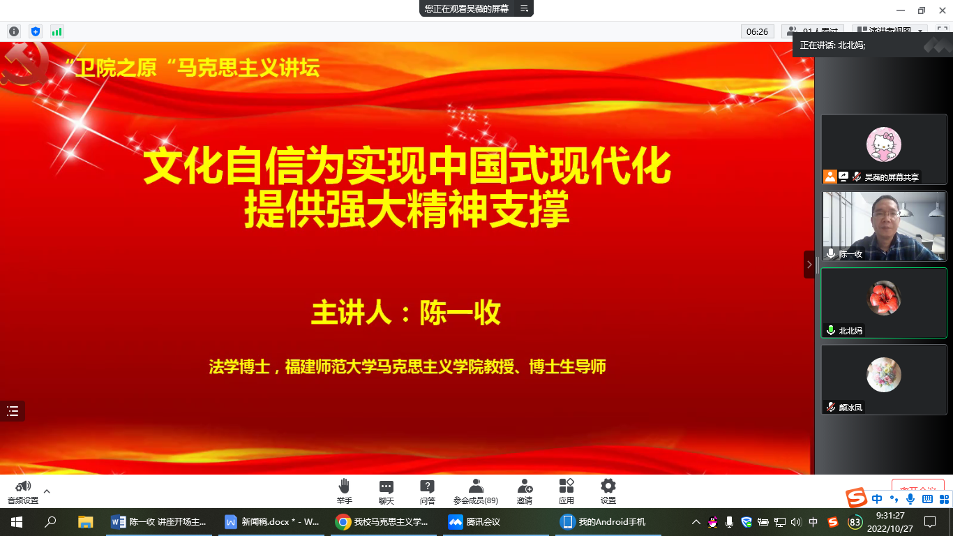 為幫助我校師生學(xué)習(xí)貫徹黨的二十大精神,從中華優(yōu)秀傳統(tǒng)文化中汲取思想精華,從百年黨史中感悟文化自信,2022年10月27日,我校馬克思主義學(xué)院邀請福建師范大學(xué)馬克思主義學(xué)院教授、博士生導(dǎo)師陳一收作題為《文化自信為實(shí)現(xiàn)中國式現(xiàn)代化提供強(qiáng)大精神支撐》專題講座。講座由馬克思主義學(xué)院副院長來朋珍主持,全體思政課教師及醫(yī)學(xué)技術(shù)系學(xué)生代表以線上方式參與。