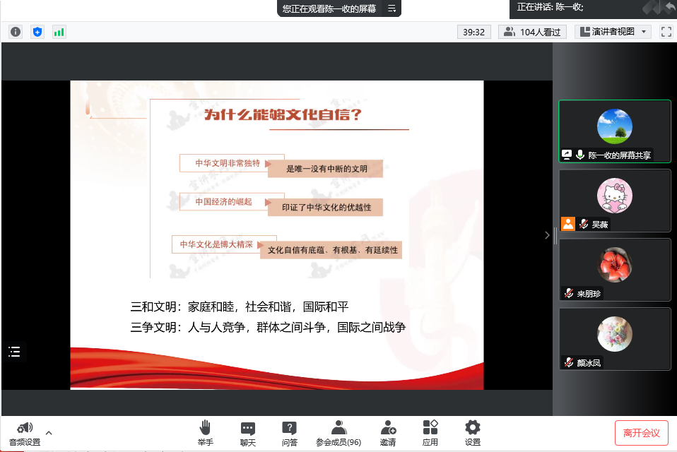 文化自信是凝聚和引領(lǐng)一個(gè)國家、一個(gè)民族勝利前行的強(qiáng)大精神力量。本次講座對增加文化自信、抵制錯(cuò)誤思潮具有重要啟發(fā)作用。我校青年學(xué)子將在文化自信中永葆深厚的家國情懷,增強(qiáng)開創(chuàng)未來的信心,當(dāng)好新時(shí)代的青春趕考人。我校思政課教師將繼續(xù)在堅(jiān)定文化自信上狠下功夫,在價(jià)值觀念上同心同德,在凝聚引領(lǐng)上同心同行,在干事創(chuàng)業(yè)上同心協(xié)力,落實(shí)好立德樹人的根本任務(wù)。