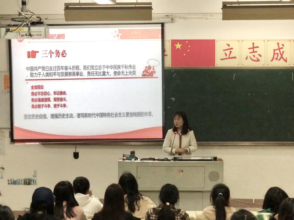 來(lái)朋珍老師從“三個(gè)務(wù)必”“五個(gè)重大原則”“五個(gè)必由之路”等方面詳細(xì)介紹了黨的二十大報(bào)告的一系列重要論點(diǎn),引導(dǎo)同學(xué)們深入學(xué)習(xí)貫徹黨的二十大精神,深刻理解黨的二十大召開(kāi)的重大意義,同時(shí)也激勵(lì)同學(xué)們更加緊密地團(tuán)結(jié)在以習(xí)近平同志為核心的黨中央周?chē)?,高舉中國(guó)特色社會(huì)主義偉大旗幟,堅(jiān)定道路自信、理論自信、制度自信、文化自信,為全面建設(shè)社會(huì)主義現(xiàn)代化國(guó)家、全面推進(jìn)中華民族偉大復(fù)興而團(tuán)結(jié)奮斗勇敢?jiàn)^斗。