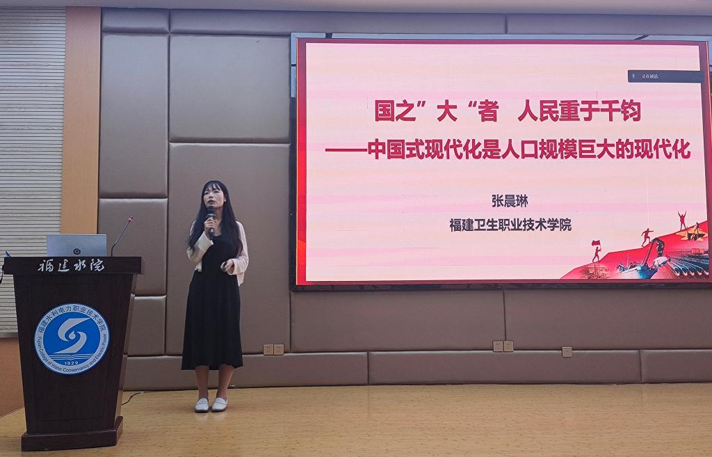 在示范課巡講環(huán)節(jié),張晨琳以《國之大者 人民重于千鈞——中國式現(xiàn)代化是人口規(guī)模巨大的現(xiàn)代化》為題,圍繞“立足國情:人口規(guī)模巨大的現(xiàn)代化”“發(fā)展要義:現(xiàn)代化的本質(zhì)是人的現(xiàn)代化”“賡續(xù)接力:繪就中國式現(xiàn)代化青春畫卷”三個方面梳理本講的內(nèi)在邏輯。張晨琳的教學展示思路清晰,教學設計富有特色,具體體現(xiàn)黨的二十大精神“三進”工作的推進,獲得評委專家和與會老師的一致好評。