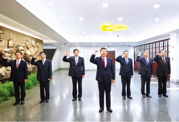 2017年10月31日,習近平帶領中共中央政治局常委李克強、栗戰(zhàn)書、汪洋、王滬寧、趙樂際、韓正,在上海中共一大會址紀念館重溫入黨誓詞。
