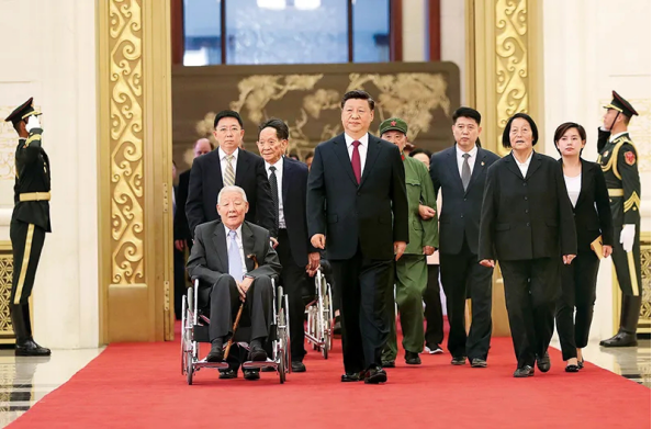 2019年9月29日,中華人民共和國國家勛章和國家榮譽稱號頒授儀式在北京人民大會堂舉行。這是習近平同國家勛章和國家榮譽稱號獲得者一同步入會場。