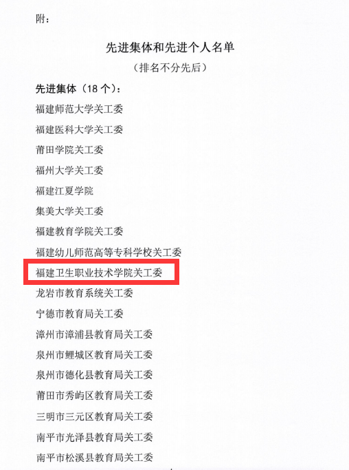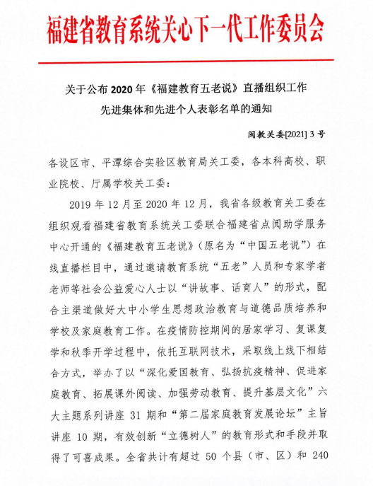 2021年1月,福建省教育系統(tǒng)關(guān)工委公布了2020年《福建教育五老說》(原名為“中國五老說”)直播組織工作先進集體和先進個人表彰名單,我校關(guān)工委榮獲2020年《福建教育五老說》直播組織工作先進集體榮譽稱號。