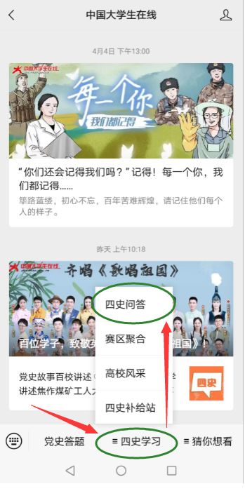 步驟2:從公眾號菜單點擊“四史學習”——“四史問答”參與答題學習。