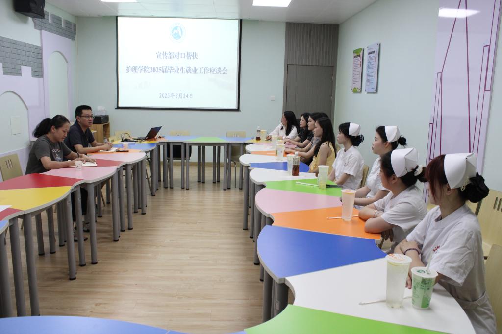 6月24日下午,宣傳部與對(duì)口幫扶的護(hù)理學(xué)院2025屆助產(chǎn)專業(yè)部分畢業(yè)生及輔導(dǎo)員老師齊聚一堂,就畢業(yè)生關(guān)注的就業(yè)問題、學(xué)校宣傳文化等工作展開深入交流。