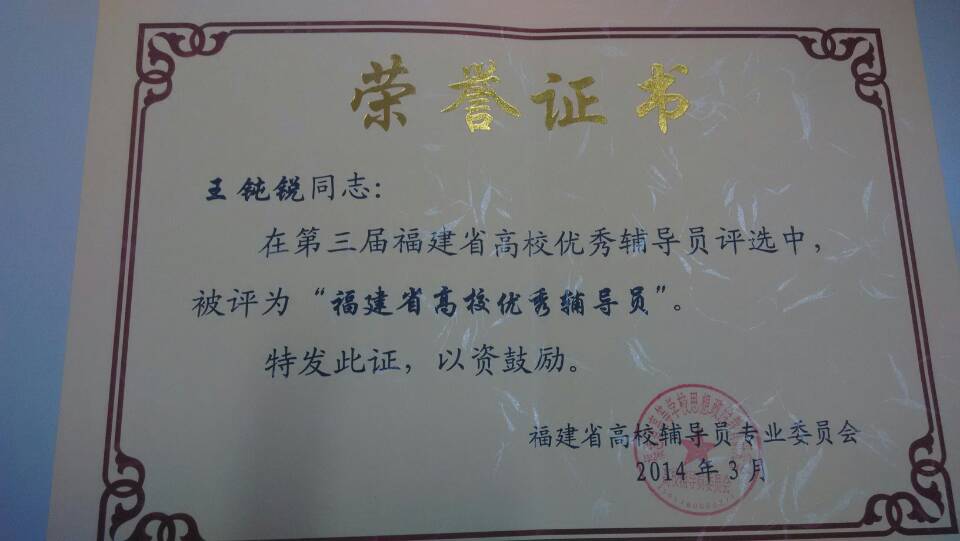 經(jīng)福建省高等學(xué)校思想政治教育研究會高校輔導(dǎo)員專業(yè)委員會評審,王鈍銳老師被評為“第三屆福建省高校優(yōu)秀輔導(dǎo)員”。希望其他輔導(dǎo)員能以王鈍銳老師為榜樣,兢兢業(yè)業(yè),認(rèn)真努力,爭當(dāng)優(yōu)秀輔導(dǎo)員。
