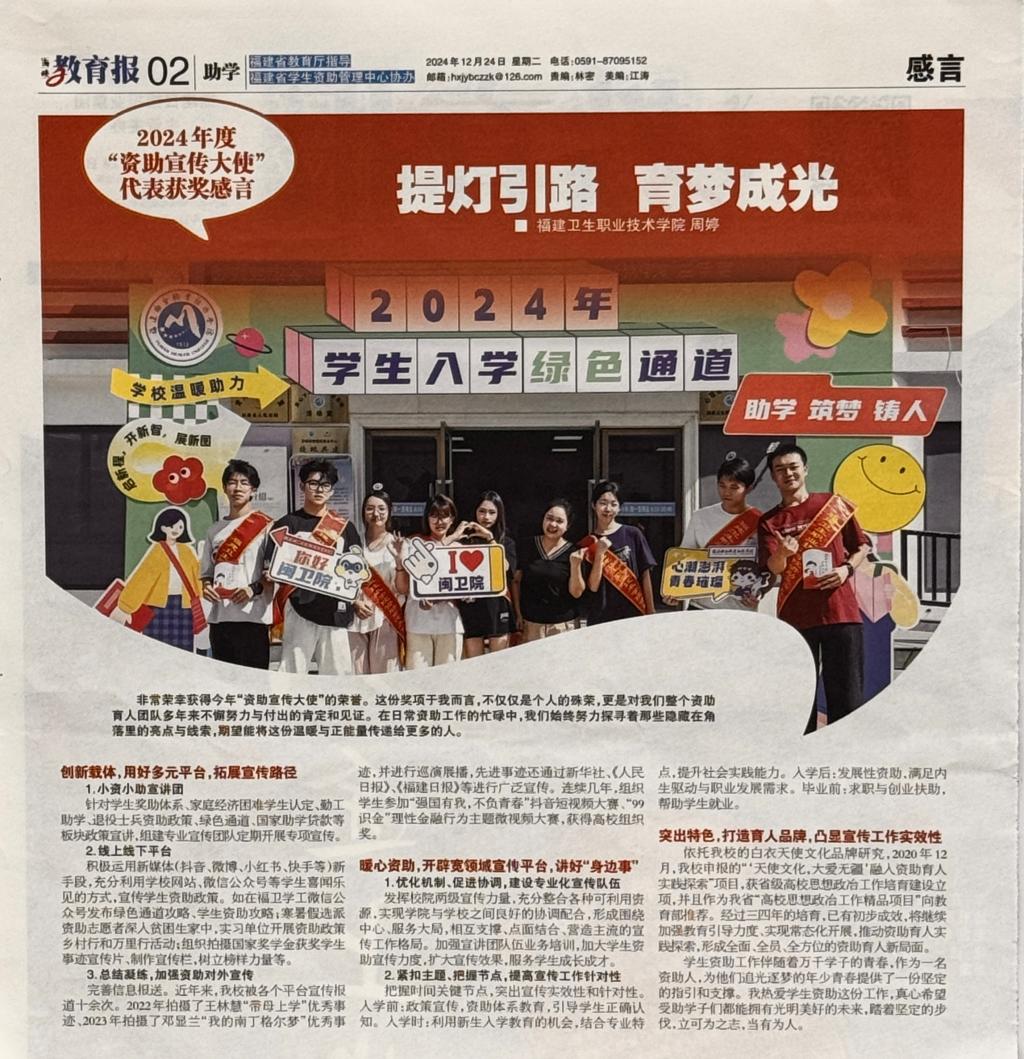 學(xué)生工作部周婷以“資助宣傳大使”的身份,在海峽教育報分享《提燈引路,育夢成光》工作感言。
