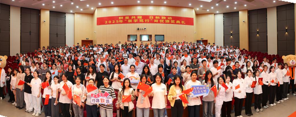 燈光漸暗,快門聲起。2025年“崇學(xué)篤行”雙優(yōu)頒獎典禮在全場燦爛的笑顏中圓滿收官。四百余名師生并肩而立,鏡頭捕捉的不僅是獲獎?wù)叩臉s光,更是閩衛(wèi)學(xué)子“崇學(xué)篤行”的精神底色。這張滿載青春熱忱的合影,將成為校園文化建設(shè)的珍貴切片,見證著集體奮斗的浪漫。正如校長寄語所言:“真正的‘卷’,是讓彼此的光芒互相照亮。”此刻的星光,終將匯成照亮未來的銀河。