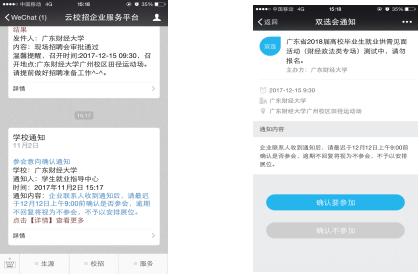 學生就業(yè)指導中心將通過企業(yè)微信端發(fā)送參會意向確認通知給審核為“現(xiàn)場招聘”的單位(如1)。企業(yè)聯(lián)系人收到通知后,點擊通知,進入確認回界面(如2)。