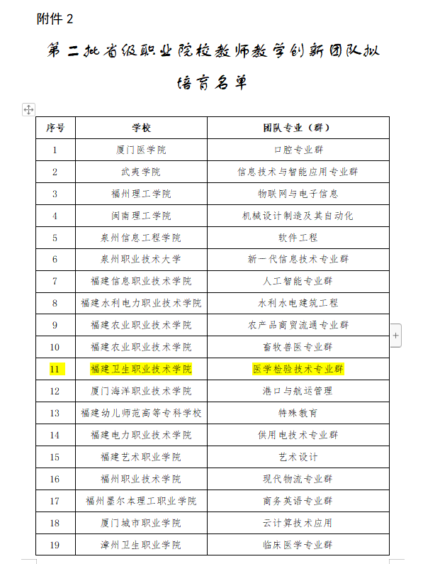 經(jīng)福建省教育廳評(píng)審,“醫(yī)學(xué)檢驗(yàn)技術(shù)專業(yè)群教師創(chuàng)新團(tuán)隊(duì)”入選第二批省級(jí)職業(yè)院校教師教學(xué)創(chuàng)新團(tuán)隊(duì)培育名單。