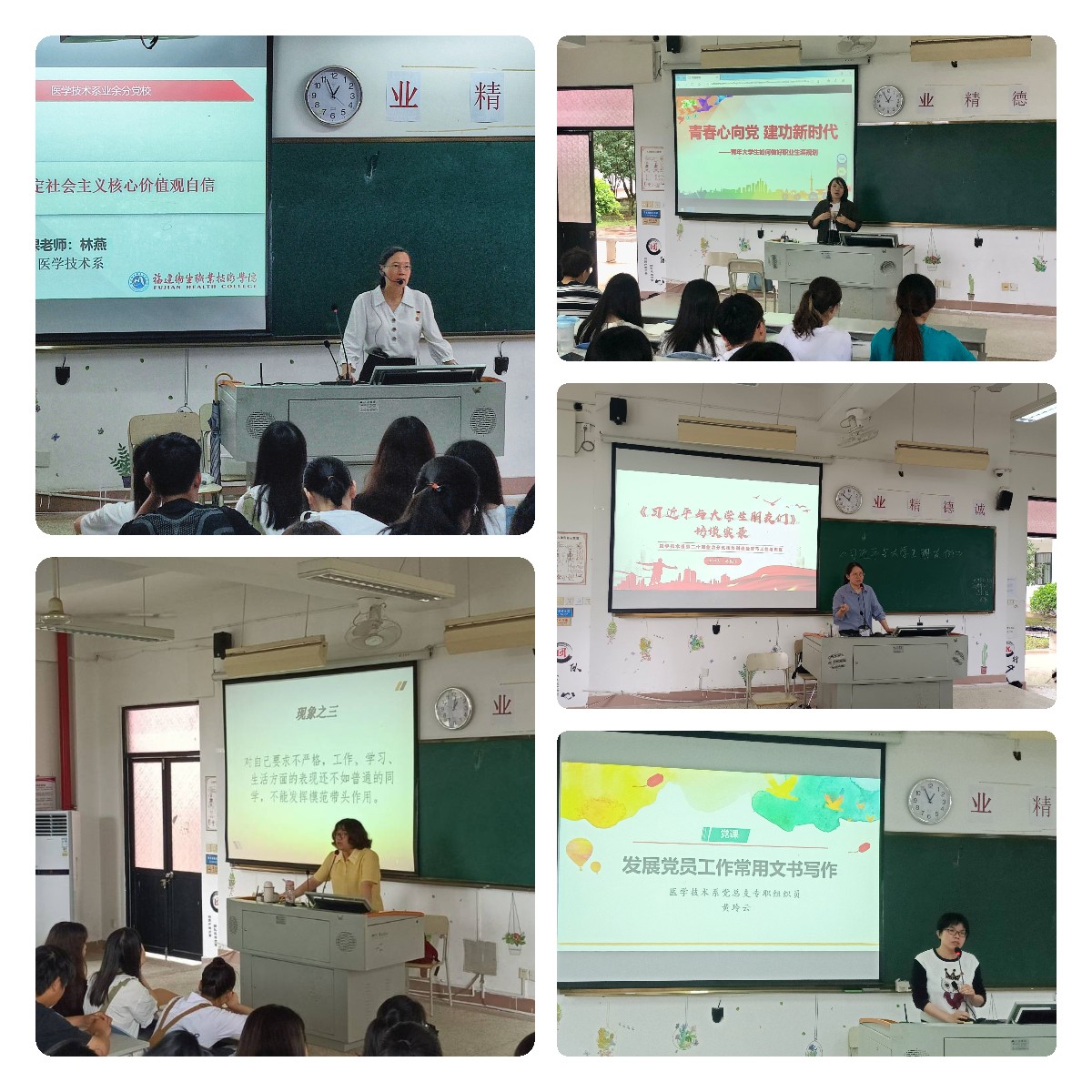醫(yī)學(xué)技術(shù)系黨總支副書記林燕圍繞社會(huì)主義核心價(jià)值觀為學(xué)員們上黨課,她強(qiáng)調(diào)新時(shí)代大學(xué)生要重視社會(huì)主義核心價(jià)值觀的培育,爭做社會(huì)主義核心價(jià)值觀模范踐行者;黨總支委員陳念文圍繞“怎樣成為一名合格的大學(xué)生黨員”主題,站在學(xué)生視角,詳細(xì)剖析新時(shí)代學(xué)生黨員的要求;學(xué)生第一黨支部書記龍梅梅以《青春心向黨,建功新時(shí)代》為題,結(jié)合職業(yè)發(fā)展規(guī)劃和就業(yè)指導(dǎo),引導(dǎo)學(xué)員們腳踏實(shí)地、以行動(dòng)入黨;學(xué)生第二黨支部書記蔣程序領(lǐng)學(xué)《習(xí)近平與大學(xué)生朋友們》,引導(dǎo)學(xué)員們深入感受到人民領(lǐng)袖對青年一代的親切關(guān)懷和殷切期望,堅(jiān)定做一名新時(shí)代有志有為青年的信念;黨總支專職組織員黃玲云開展發(fā)展黨員工作常用文書寫作指導(dǎo),引導(dǎo)學(xué)員們及時(shí)向黨組織匯報(bào)思想動(dòng)態(tài),積極接受黨組織和培養(yǎng)人的指導(dǎo)意見。