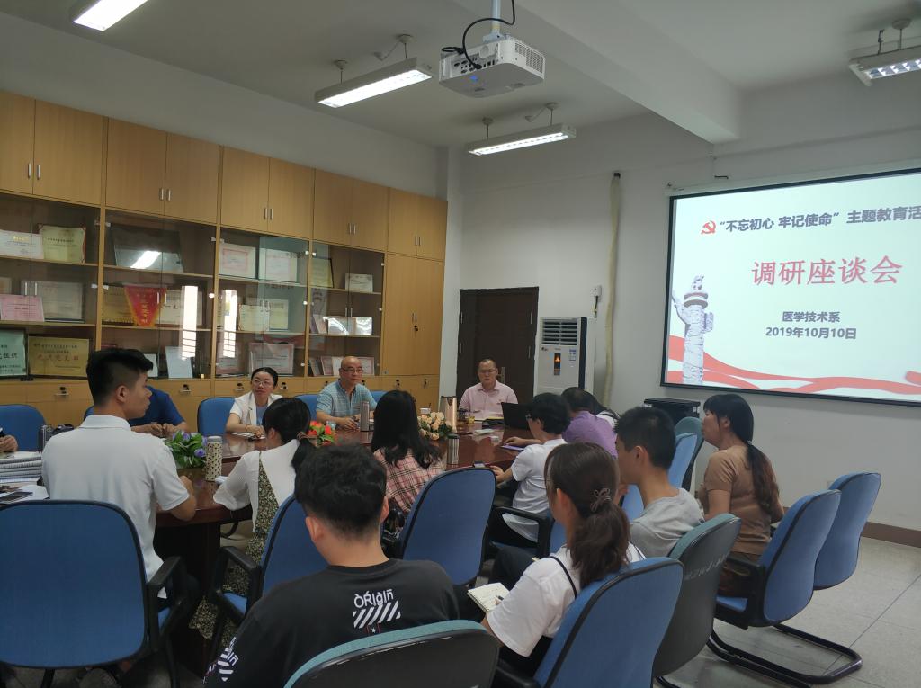根據(jù)學(xué)院黨委開展“不忘初心、牢記使命”主題教育的調(diào)研工作部署,10月10日下午,黃銘珊副院長來到醫(yī)學(xué)技術(shù)系301會(huì)議室召開專題調(diào)研座談會(huì)。會(huì)議由醫(yī)學(xué)技術(shù)系黨總支負(fù)責(zé)人邱滾忠同志主持,系部領(lǐng)導(dǎo)班子、教研室主任、實(shí)訓(xùn)中心主任、系部辦公室工作人員、輔導(dǎo)員代表、學(xué)生代表等師生代表參加了調(diào)研座談會(huì)。