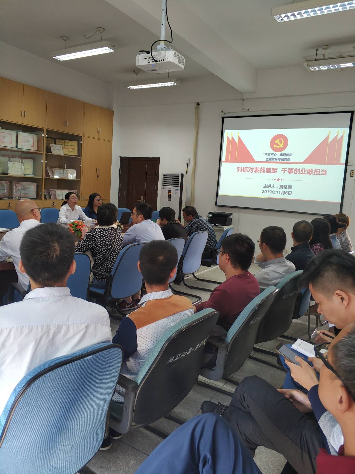 2019年11月6日,學(xué)院黨委委員、副院長黃銘珊同志蒞臨醫(yī)學(xué)技術(shù)系,以《對標(biāo)對表找差距 干事創(chuàng)業(yè)敢擔(dān)當(dāng)》為題,在醫(yī)學(xué)技術(shù)系會議室講授主題教育專題黨課。醫(yī)學(xué)技術(shù)系黨總支負(fù)責(zé)人邱滾忠同志主持黨課,醫(yī)學(xué)技術(shù)系全體教職工到場聆聽,學(xué)院辦公室、保衛(wèi)處、繼續(xù)教育中心負(fù)責(zé)人等到場共同學(xué)習(xí)。