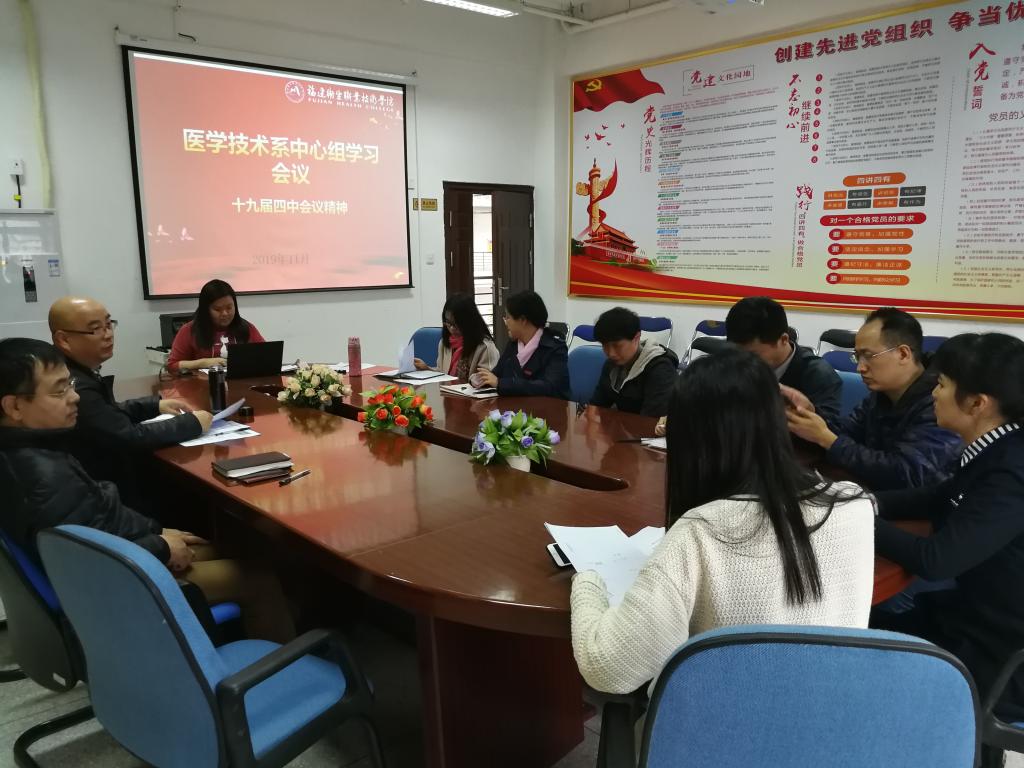 2019年11月28日, 醫(yī)學(xué)技術(shù)系在系部樓301召開中心組學(xué)習(xí)會議,學(xué)習(xí)黨的十九屆四中全會精神,會議由系黨總支負(fù)責(zé)人邱滾忠同志主持。