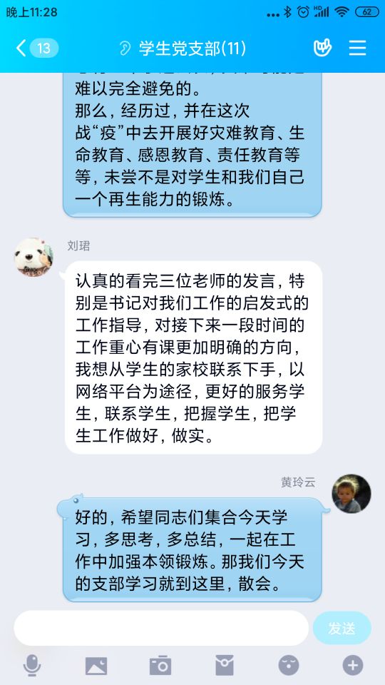 2月20日晚,在線學(xué)習(xí)的第四天,醫(yī)學(xué)技術(shù)系第一、第二和學(xué)生黨支部開展了一次特別的支部大會,圍繞“停課不停學(xué)”開展學(xué)習(xí)和討論,總結(jié)提升教學(xué)經(jīng)驗。黨員老師學(xué)習(xí)了習(xí)近平總書記在中央政治局常委會會議研究應(yīng)對新型冠狀病毒肺炎疫情工作時的講話,學(xué)習(xí)了《教育部應(yīng)對新型冠狀病毒肺炎疫情工作領(lǐng)導(dǎo)小組辦公室關(guān)于在疫情防控期間有針對性地做好教師工作若干事項的通知》,認真領(lǐng)會防疫工作重要精神和工作部署,進一步增強黨員教師對打贏這場戰(zhàn)“疫”的信心。同時,結(jié)合學(xué)習(xí)強國APP文章《“停課不停學(xué)”,教師如何調(diào)整角色》,教師黨支部著重從如何組織好在線教學(xué)開展了深入交流;學(xué)生黨支部則側(cè)重探討如何引導(dǎo)學(xué)生有效開展線上學(xué)習(xí)。大家都認為本次全課程的線上教學(xué)是一次培養(yǎng)學(xué)生自主學(xué)習(xí)能力的好機會,有效的指引、多樣的互動、及時的評價,可以達到較好的停課不停學(xué)效果。