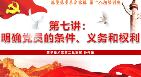 6月19日,醫(yī)學(xué)技術(shù)系第十八期業(yè)余分黨校培訓(xùn)班第八課開講,醫(yī)學(xué)技術(shù)系第二黨支部書記鐘偉雄擔(dān)任此次課程的主講人。本次課程的主題為“明確黨員的條件、義務(wù)和權(quán)力”。他為學(xué)員們深入解讀了成為一名黨員的基本條件,介紹了黨員的八項(xiàng)權(quán)利與義務(wù)。他強(qiáng)調(diào),黨員義務(wù)是黨對黨員的基本要求,是黨員條件的具體化,希望學(xué)員們在日常學(xué)習(xí)工作生活中能以一名合格黨員的具體標(biāo)準(zhǔn)要求自己,不斷以實(shí)際行動向黨組織靠攏。