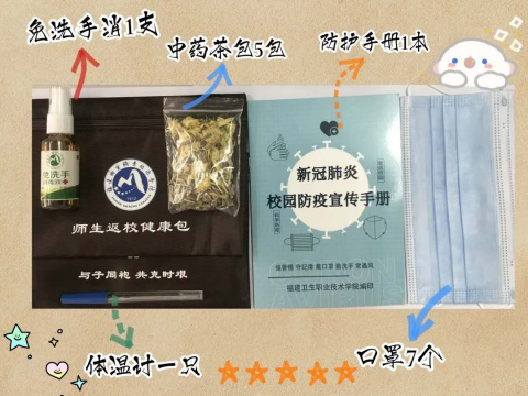 還有,老師們?yōu)橥瑢W(xué)們準(zhǔn)備的可不僅僅只是干凈整潔的宿舍哦!為保障返校后安全,你們可愛的輔導(dǎo)員們還利用休息時間,親力親為,用心的為每個同學(xué)準(zhǔn)備健康包。為了不遺漏健康包的物品,他們采用流水線作業(yè),有的裝口罩,有的裝洗手液、體溫計、藥茶包,有條不紊,一絲不茍。每個健康包里面有:免洗消毒液一支、中藥茶包五包、體溫計一支、防護(hù)手冊一本、口罩七個。雖然東西不多,但是包含了學(xué)校和老師對同學(xué)們滿滿的愛。