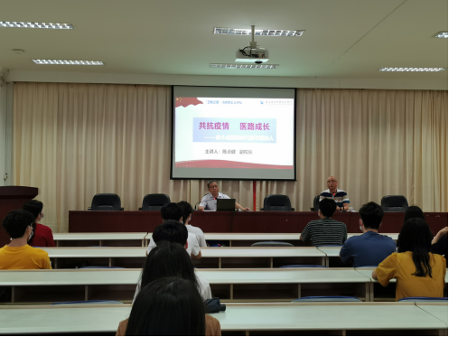 為了教育學(xué)生涵養(yǎng)愛國主義情懷,幫助學(xué)生掌握疫情防控知識、增強疫情防控意識、提高疫情防控能力,引導(dǎo)學(xué)生關(guān)注自身心理健康、保持昂揚的精神面貌,堅定戰(zhàn)勝疫情的信心。2020年7月2日,陳貞健副院長以《共抗疫情 ,醫(yī)路成長——奮斗成就新時代最可愛的人》為題,采用“線上+線下”相結(jié)合的形式為醫(yī)學(xué)技術(shù)系返校復(fù)學(xué)學(xué)生講授思政戰(zhàn)“疫”第一課。醫(yī)學(xué)技術(shù)系邱滾忠副書記主持本次授課活動。