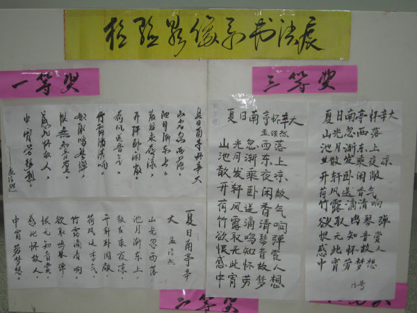 為豐富同學(xué)們的課余活動(dòng),提高對(duì)中國書法的鑒賞能力,同時(shí)發(fā)掘系部書法方面的優(yōu)秀人才,檢驗(yàn)影像系于2007年10月11日下午4:00在系二階舉行書法比賽。本次比賽共收到參賽作品50余件,其參賽作品之多,書法技藝之高超,令評(píng)委驚喜。經(jīng)過評(píng)委的認(rèn)真評(píng)選,最終選出一等獎(jiǎng)2名,二等獎(jiǎng)4名,三等獎(jiǎng)6名,優(yōu)秀獎(jiǎng)8名,而所有獲獎(jiǎng)?wù)叨紝@得相應(yīng)的素質(zhì)拓展加分。 漢語是世界上活著的最古老的語言,而用文字形成書法藝術(shù)的又只有漢字,這是我們應(yīng)該引以驕傲和自豪的事。舉行書法比賽對(duì)于弘揚(yáng)中華傳統(tǒng)文化、陶冶情操都是大有裨益的。相信每一位參賽者在這次比賽中都有所收獲,讓同學(xué)們從中既能感受到中國書法藝術(shù)的魅力,又能被激發(fā)起強(qiáng)烈的學(xué)習(xí)熱情,讓這一國粹能綿延不斷傳承下去。