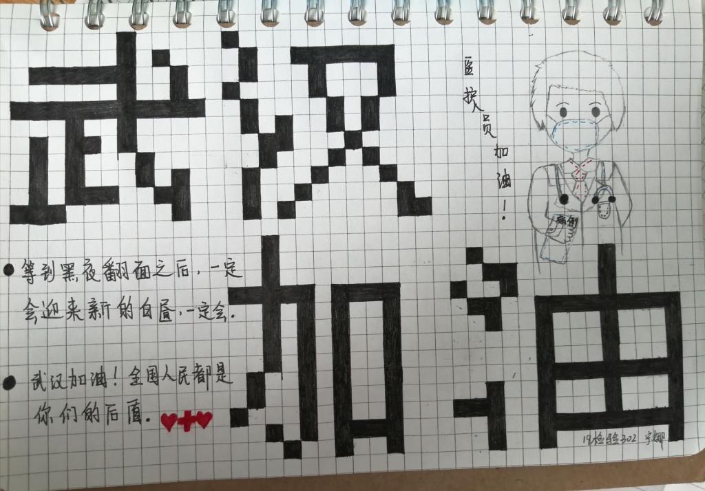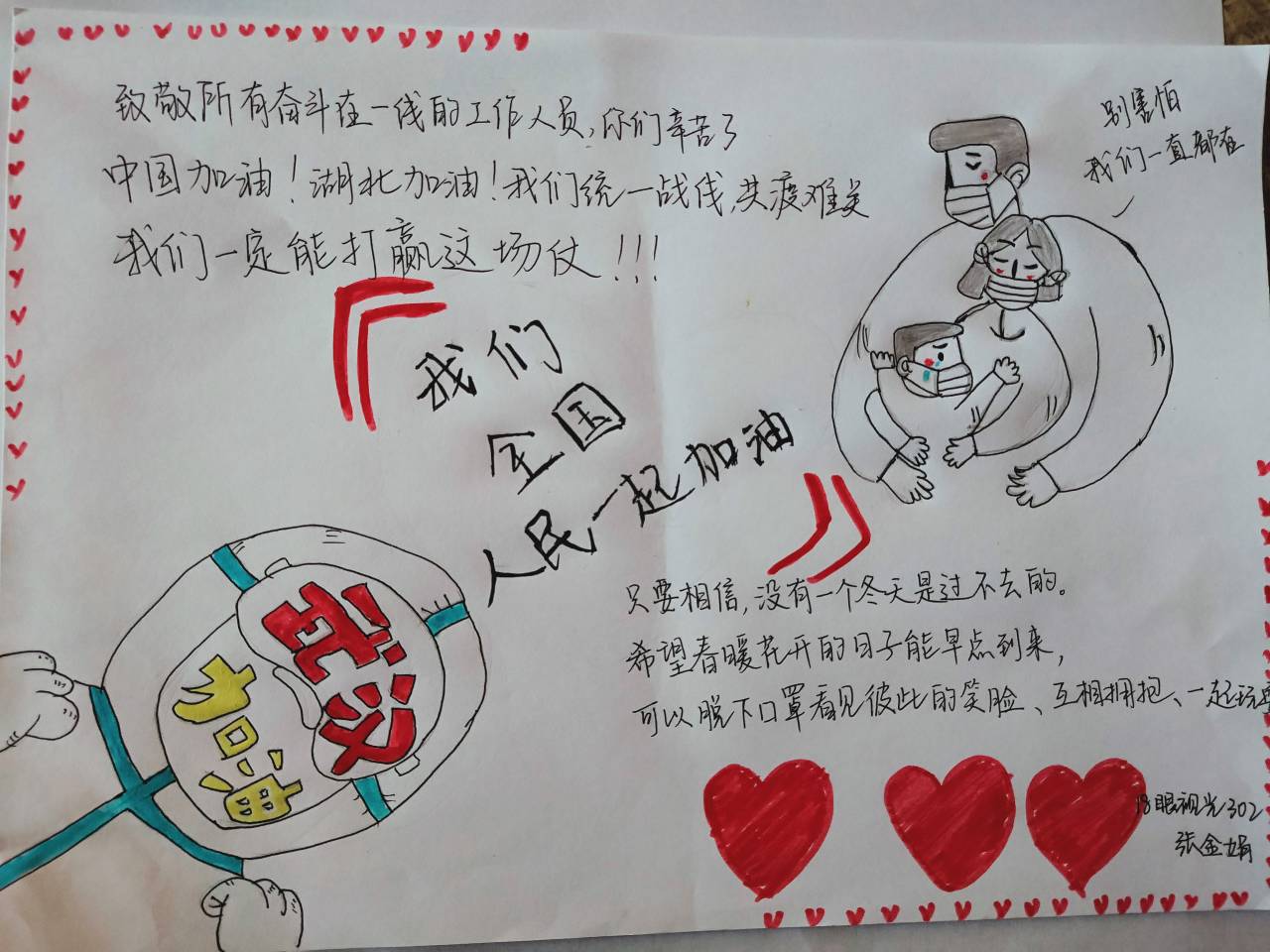 抗擊疫情,我們從未松懈,在這危急時刻,盡管我們身處各地,但是,我們依舊與武漢同胞們風雨同行,安危與共!在一張張雪白的紙上寫下自己對一線醫(yī)務工作者的關心和對于戰(zhàn)勝疫情的信心,希望能早日戰(zhàn)勝疫情,期盼著奮斗在一線的英雄們能早日平安歸來,與我們同行。