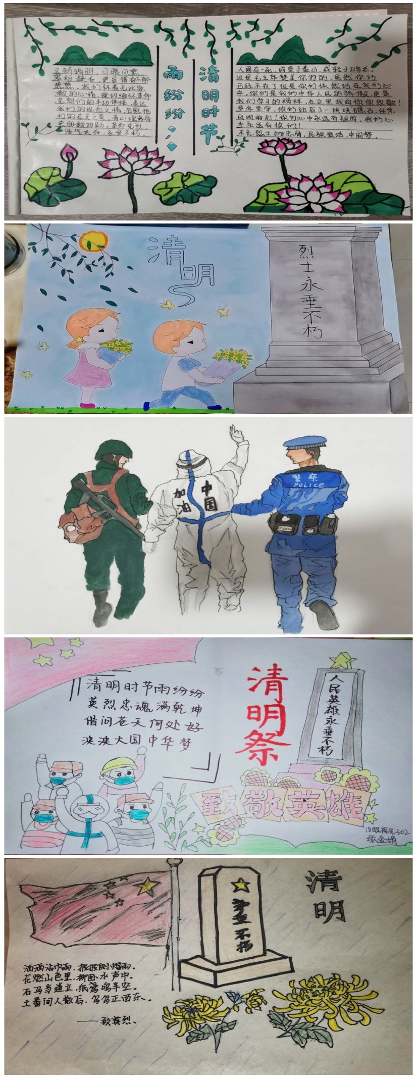 各班積極開(kāi)展書(shū)法、繪畫(huà)以及傳統(tǒng)非遺藝術(shù)作品創(chuàng)作,通過(guò)書(shū)畫(huà)作品體現(xiàn)慎終追遠(yuǎn)、禮敬英雄的情懷,表達(dá)對(duì)英烈的緬懷和紀(jì)念,并向奮戰(zhàn)在一線的醫(yī)護(hù)人員與為社會(huì)作出貢獻(xiàn)的人民致以崇高的敬意。經(jīng)過(guò)綜合評(píng)選,最終以下13幅作品脫穎而出。